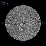 The south pole of Mimas taken by Voyager 1, 127,000 km (79,000 miles) away with a resolution of 1 km/pixel.[37]