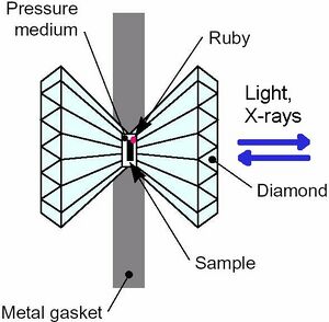 خلية سندان الماس عبارة عن جهاز سطح طاولة صغير لتركيز الضغط. يمكنه ضغط قطعة صغيرة (بحجم أقل من المليمتر) من المادة إلى الضغط الشديد، والتي يمكن أن تتجاوز 3.000.000 وحدة جوية (300 جيجا باسكال).[7] يتجاوز هذا الضغوط في مركز الأرض. قد يكون تركيز الضغط على طرف الماس بسبب الصلابة، في حين أن الشفافية وارتفاع التوصيل الحراري يسمحان بمجموعة متنوعة من المسابير التي تستخدم لفحص حالة العينة. يمكن تسخين العينة إلى آلاف الدرجات.