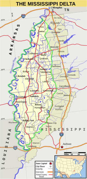 دلتا المسيسبي Mississippi Delta، وتُعرف أيضاً بإسم دلتا اليازو-ميسيسيبي Yazoo–Mississippi Delta، أو ببساطة الدلتا, is the distinctive northwest section of the U.S. state of Mississippi (and portions of Arkansas and Louisiana) that lies between the Mississippi and Yazoo rivers. The region has been called "The Most Southern Place on Earth"[1] ("Southern" in the sense of "characteristic of its region, the American South"), because of its unique racial, cultural, and economic history.