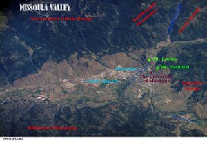 Around 13,000 years ago, the entire valley was at the bottom of Glacial Lake Missoula. As could be expected for a former lake bottom, the layout of Missoula is relatively flat and surrounded by steep hills. Evidence of the city of Missoula's lake-bottom past can be seen in the form of ancient horizontal wave-cut shorelines on nearby Mount Sentinel and Mount Jumbo.[33] At the location of present-day University of Montana, the lake once had a depth of 950 أقدام (290 m).[34] The Clark Fork River enters the Missoula Valley from the east through Hellgate Canyon after joining the nearby Blackfoot River at the site of the former Milltown Dam. The Bitterroot River and multiple smaller tributaries join the Clark Fork on the western edge of Missoula. The city also sits at the convergence of five mountain ranges: the Bitterroot Mountains, Sapphire Range, Garnet Range, Rattlesnake Mountains, and the Reservation Divide, thus is often described as being the "hub of five valleys".[6]