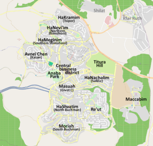 هاپراشيم -الأزهار (ميرومي) وهو خي صغير في مركز المدينة، وبداخله مركز تجاري، ومدرستين ابتدائيتين ومدرسة ثانوية. وتم تسمية شوارع الحي على اسم الأشجار والزهور والنباتات. في الجزء الشمالي من الحي هناك مجمع سكني سميت شوارع على اسم مقاطع من نشيد الأناشيد. هاناخليم- نهري (صفدي) و ماسواح- منارة (جيڤات سي) يقعان في إتجاه غرب المدينة، وقام بالتخطيط لهما موشيه صفدي. يقع في هذا الحي خمسة مراكز تجاري ومدرسة ثانوية وثلاث مدارس إبتدائية. تسمى الشوارع الرئيسية على اسم أودية في إسرائيل، وتسمى الشوارع الجانبية على اسم أنهار إسرائيل وتقع على ارتفاعات عالية. تميت منطقة "ماليبو"، التي تقع داخل المنطقة التي سميت شوارع على اسماءالانهار والمجاري المائية، كغيرها من المناطق، على اسم الشخص الذي قام بتخطيط الحي.