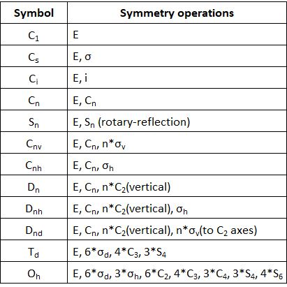 Point group | Symmetry operations[12] | Simple description of typical geometry | مثال 1 | مثال 2 | مثال 3 |