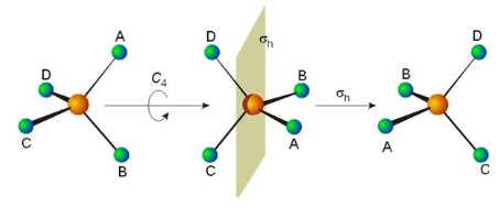 - Rotation-reflection axis: an axis around which a rotation by , followed by a reflection in a plane perpendicular to it, leaves the molecule unchanged. Also called an n-fold improper rotation axis, it is abbreviated Sn. Examples are present in tetrahedral silicon tetrafluoride, with three S4 axes, and the staggered conformation of ethane with one S6 axis. An S1 axis corresponds to a mirror plane σ and an S2 axis is an inversion center i. A molecule which has no Sn axis for any value of n is a chiral molecule.