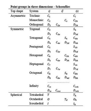 The following table lists many of the point groups applicable to molecules, labelled using the Schoenflies notation, which is common in chemistry and molecular spectroscopy. The descriptions include common shapes of molecules, which can be explained by the VSEPR model. In each row, the descriptions and examples have no higher symmetries, meaning that the named point group captures all of the point symmetries.