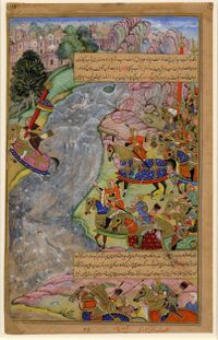 The Muslim Negudari governor Abdullah, who was a son of Chagatai Khan's great-grandson,[12] invaded Punjab with his force in 1292, but his advance guard under Ulghu was defeated and taken prisoner by the Khalji sultan Jalaluddin. The medieval sources claim invasions by hundreds of thousands of Mongols, numbers approximating (and probably based on) the size of the entire cavalry armies of the Mongol realms of Central Asia or Western Asia.[13] The number of 150,000 Mongol invaders during 1292 opposed by Jalaluddin were also recorded in Wolseley Haig's work of The Cambridge History of India.[14] A count of the Mongol commanders named in the sources as participating in the various invasions might give a better indication of the numbers involved, as these commanders probably led tumens, units nominally of 10,000 men.[15] These invasions were led by either various descendants of Genghis Khan or by Mongol divisional commanders; the size of such armies was always between 10,000 and 30,000 cavalry although the chroniclers of Delhi exaggerated the number to 100,000-200,000 cavalry.[16] The 4,000 Mongol captives of the advance guard converted to Islam and came to live in Delhi as "new Muslims". The suburb they lived in was appropriately named Mughalpura.[17][18] Chagatai tumens were defeated by the Delhi Sultanate several times in 1296–1297.[19]