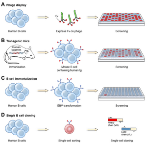 Ever since the discovery that monoclonal antibodies could be generated, scientists have targeted the creation of fully human products to reduce the side effects of humanised or chimeric antibodies. Several successful approaches have been identified: transgenic mice,[12] phage display[13] and single B cell cloning:[11]