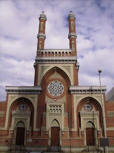 By the mid-19th century, the style was adopted by the Jews of Central Europe, who associated Moorish and Mudéjar architectural forms with the golden age of Jewry in medieval Muslim Spain.[3] It has also been argued[ممن؟] that Jewish communities adopted this architecture (which in Western eyes was seen as stereotypical of "Islamic" or "Oriental" culture more broadly) for more complex reasons; mainly, as an affirmation or reclamation of the Middle Eastern or Semitic roots of their history and thus as a way of setting themselves apart from the surrounding Western or Christian society.[3][4] This came at time when Jews were gaining more freedoms in some European societies and the construction of ostentatious synagogues was possible for the first time, thus provoking a search for a new distinct style of architecture. Historian John M. Efron of the University of California at Berkeley regards the popularity of Moorish revival architecture among builders of synagogues as a counterpoint to Edward Said's Orientalism, which criticizes European orientalism as inherently imperialist and racist, since the builders chose the style as an expression of admiration for the culture of the Muslim world.[5] As a consequence, Moorish Revival spread around the globe as a preferred style of synagogue architecture for a long period until the early 20th century.[4][3]