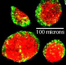 Example of cell sorting out with cultured P19 embryonal carcinoma cells. Live cells were stained with either DiI (red) or DiO (green). The red cells were genetically altered and express higher levels of E-cadherin than the green cells. After labeling, the two populations of cells were mixed and cultured together allowing the cells to form large multi-cellular mixed aggregates. Individual cells are less than 10 micrometres in diameter. The image was captured by scanning confocal microscopy.