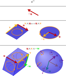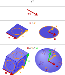 Geometric interpretation of grade n elements in a real exterior algebra for n = 0 (signed point), 1 (directed line segment, or vector), 2 (oriented plane element), 3 (oriented volume). The exterior product of n vectors can be visualized as any n-dimensional shape (e.g. n-parallelotope, n-ellipsoid); with magnitude (hypervolume), and orientation defined by that on its (n − 1)-dimensional boundary and on which side the interior is.[19][20]