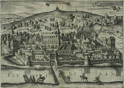 According to the Oxford English Dictionary, the English name Russia first appeared in the 14th century, borrowed from Medieval Latin Russia, which was in turn a rendition of the Byzantine Greek name for Rus', Ρωσία (Rosía).[12] The word Ruthenia originated as a Latin designation of the region its people called Rus'. Rusia or Ruthenia appears in the 1520 Latin treatise Mores, leges et ritus omnium gentium, per Ioannem Boëmum, Aubanum, Teutonicum ex multis clarissimis rerum scriptoribus collecti by Johann Boemus. In the chapter De Rusia sive Ruthenia, et recentibus Rusianorum moribus ("About Rus', or Ruthenia, and modern customs of the Rus'"), Boemus tells of a country extending from the Baltic Sea to the Caspian Sea and from the Don River to the northern ocean. It is a source of beeswax, its forests harbor many animals with valuable fur, and the capital city Moscow (Moscovia), named after the Moskva River (Moscum amnem), is 14 miles in circumference.[13][14] Danish diplomat Jacob Ulfeldt, who traveled to Russia in 1578 to meet with Tsar Ivan IV, titled his posthumously (1608) published memoir Hodoeporicon Ruthenicum[15] ("Voyage to Ruthenia").[16]