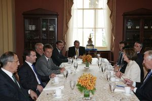 پلوسي تلتقي الرئيس الروسي دميتري مدڤييدڤ، وزير الخارجية سرگي لاڤروڤ، يونيو 2010.