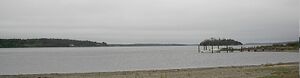 Narragansett Bay is divided by Conanicut Island into east and west passages. Its depth averages approximately 9.0 meters throughout the bay, but it is shallower in the west passage and deeper in the east.[17] Narragansett Bay receives freshwater input from several sources, including rivers (approximately 80%), direct precipitation (13%), wastewater treatment facilities (9%), and unknown amounts from ground-water and combined sewer overflows (CSOs).[17] The freshwater input varies greatly from season to season as it is highest in winter and lowest in summer, while CSOs increase dramatically following heavy rain. Water from these freshwater inputs mixes with sea water to form a salinity gradient ranging from 24 ppt at the mouth of the Providence River to 32 ppt at the mouth of the bay.[17] Water temperatures range between -0.5 °C and 24 °C over the year. Salinity and temperature patterns measured throughout the bay indicate a range of mixed to stratified conditions [18] and the amount of time it takes for the total volume of fresh water in the bay to be equaled by the fresh water input (flushing time) varies from 40 days to 10 days, depending on freshwater input.[19]