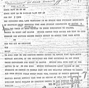 في عام 1960 دعا طالب في جامعة جنوب كاليفورنيا يدعى جورج حرب الرئيس المصري جمال عبد الناصر لإلقاء كلمة في الحرم الجامعي.