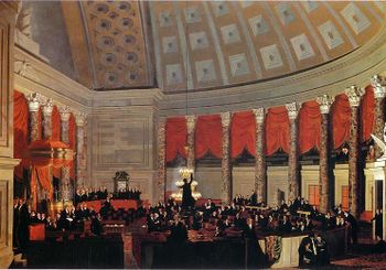 Samuel F.B. Morse's 1823 oil painting House of Representatives depicts a night session of the United States House of Representatives in the old Hall of the House.