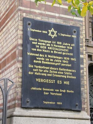 - ^ In the original: "Die Platzinhaber werden hierdurch aufgefordert, ihre Gebetutensilien bis Montag, den 8. April, mittags 12 Uhr, aus den Pulten herauszunehmen." Quote from 'Jüdisches Nachrichtenblatt' after Cf. Olaf Matthes, Die Neue Synagoge, Markus Sebastian Braun (ed.), Berlin: Berlin-Edition, 2000, (=Berliner Ansichten; vol. 16), p. 58. ISBN 3-8148-0025-7.