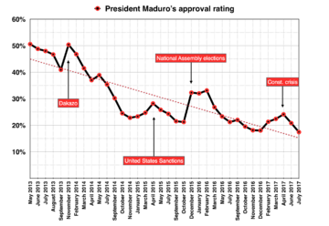 في مايو 2017، اقترح مادورو إجراء انتخابات الجمعية التأسيسية الڤنزويلية 2017، والتي أجريت لاحقاً في 30 يوليو 2017 على الرغم من الإدانة الدولية الدامغة.[88][89] عقب الانتخابات فرضت الولايات المتحدة عقوبات على مادورو، ووصفته بأنه "ديكتاتور"، ومنعته من دخول الولايات المتحدة.[90] ودول أخرى، مثل الصين،[91] أبدت روسيا،[92] وكوبا [93] دعمهم لمادورو وانتخابات الجمعية التأسيسية. وتم تقديم موعد الانتخابات الرئاسية، التي كان من المقرر إجراؤها في ديسمبر 2018، إلى 22 أبريل، قبل تأجيلها إلى 20 مايو.[94][95][96] وصف المحللون الاستطلاع بأنه انتخابات استعراضية،[97][98] وشهدت الانتخابات أدنى نسبة مشاركة للناخبين في العصر الديمقراطي الذي تشهده البلاد.[99][100]