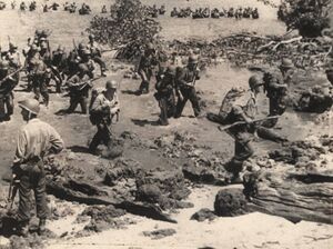 The Empire of Japan invaded Maluku early in 1942 as part of its Dutch East Indies Campaign of World War II, ousting the Dutch from the region. Halmahera became the site of a Japanese naval base at Kao Bay. 2 years later, US forces and their allies launched the Battle of Morotai in 1944; bombing the island in August and invading it in September. Imperial Japanese forces on Morotai held out until 1945 but failed to expel the Allies. In the latter part of 1944, 61,000 personnel landed on Morotai.[34] Two thirds of them were engineers, who rapidly established facilities including harbors and two airstrips[34] plus extensive fuel stores. The formal surrender of the Second Japanese Army took place at Morotai on 9 September 1945. The last Japanese holdout from the war, Private Teruo Nakamura (Amis: Attun Palalin), was discovered by the Indonesian Air Force on Morotai, and surrendered to a search patrol on December 18, 1974.[35]