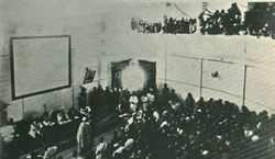 بعد ذلك سمح للجمهور بدخول قاعة الجلسات، بينما جلس المتهم في المكان المخصص للمتهمين، تحت حراسة عسكرية، وهو طليق اليدين وغير مكبل بأغلال من أي نوع.