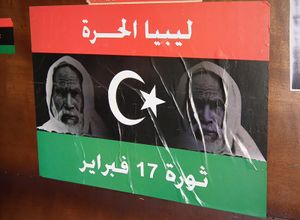 صورة عمر المختار على علم مملكة ليبيا، والذي اتخذه الثوار علما لهم أثناء الثورة الليبية 2011.