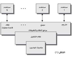 توفِّر العتاديات -وهي وحدة المعالجة المركزية CPU، والذاكرة، وتجهيزات الدخل/الخرج O/I ـ المواردَ resources الأساسية للحاسوب. وتُستخدم هذه الموارد لحل المسائل الحاسوبية الخاصة بالمستخدمين، وذلك بطريقة تعرّفها البرامج التطبيقية، مثل المترجمات compilers، ونظم قواعد المعطيات، والألعاب، والبرامج الخاصة بالأعمال business. قد يقوم مستخدِمون مختلفون (أشخاص، تجهيزات، حواسيب أخرى) بحل مسائل مختلفة، وذلك عن طريق برامج تطبيقية عدة ومختلفة. لذا يتولى نظام التشغيل مهمة مراقبة وتنسيق استخدام العتاديات بين مختلف البرامج التطبيقية لمختلف المستخدمين.
