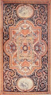 Right image: French adaptation: Tapis de Savonnerie, under Louis XIV, after Charles Le Brun, made for the Grande Galerie in the Louvre Palace.