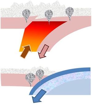 Two processes that can contribute to an orogen. Top: delamination by intrusion of hot asthenosphere; Bottom: Subduction of ocean crust. The two processes lead to differently located granites (bubbles in diagram), providing evidence as to which process actually occurred.[2]