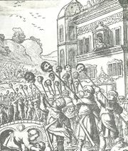 Drawing of the capture of Tabriz and the parading before Shah Abbas I of the severed heads of Ottoman soldiers. Drawn by a European traveller, 1603.