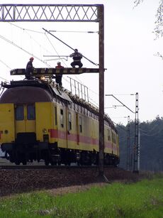 An overhead line or overhead wire is an electrical cable that is used to transmit electrical energy to electric locomotives, electric multiple units, trolleybuses or trams. The generic term used by the International Union of Railways for the technology is overhead line.[1] It is known variously as overhead catenary, overhead contact line (OCL), overhead contact system (OCS), overhead equipment (OHE), overhead line equipment (OLE or OHLE), overhead lines (OHL), overhead wiring (OHW), traction wire, and trolley wire.
