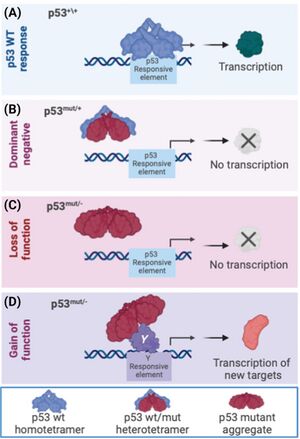 Most cancer-associated mutations in TP53 occur in the DBD, impairing DNA binding and transcriptional activation. These are typically recessive loss-of-function mutations. By contrast, mutations in the OD can exert dominant negative effects by forming inactive complexes with wild-type p53.