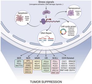 p53 functions as a transcription factor by binding DNA as a tetramer, a structure that is essential for its stability and effective DNA binding activity.[30] Once bound to DNA, p53 induces the transcription of numerous genes involved in DNA repair pathways. This includes components of base excision repair (BER) such as OGG1 and MUTYH, nucleotide excision repair (NER) factors like DDB2 and XPC, mismatch repair (MMR) genes such as MSH2 and MLH1, and elements of homologous recombination (HR) and non-homologous end-joining (NHEJ) repair.[31][32] These transcriptional responses are crucial for the DNA damage response (DDR), allowing cells to efficiently repair damaged DNA and maintain genomic integrity. While p53's role is most clearly defined in transcriptional activation of repair genes, it also participates in non-transcriptional regulation of DNA repair processes, particularly in HR and NHEJ, by modulating protein interactions and chromatin accessibility.[31][33]