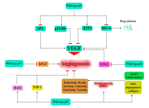 Apart from the cellular and molecular effects above, p53 has a tissue-level anticancer effect that works by inhibiting angiogenesis.[52] As tumors grow they need to recruit new blood vessels to supply them, and p53 inhibits that by (i) interfering with regulators of tumor hypoxia that also affect angiogenesis, such as HIF1 and HIF2, (ii) inhibiting the production of angiogenic promoting factors, and (iii) directly increasing the production of angiogenesis inhibitors, such as arresten.[53][54]