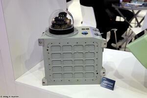 The UOMZ 101KS "Atoll" electro-optical system consisted of the 101KS-V infrared search and track (IRST), 101KS-O directional infrared counter measures (DIRCM), 101KS-U ultraviolet missile approach warning sensors (MAWS), 101KS-P thermal imager for low altitude flight and landing, and 101KS-N navigation and targeting pod.[147] The IRST turret is mounted on the starboard side in front of the cockpit and can track multiple targets simultaneously. When not in use, the receiver is turned backwards and its rear is treated with RAM to preserve stealth. Additionally, the Su-57 is the first fighter to mount a DIRCM system, with one turret mounted behind the canopy and another mounted under the cockpit.[143][148] The aircraft is capable of deploying countermeasures such as flares and radar decoys, as well as single-use programmable ECM transmitters. The dispensers for these countermeasures are mounted in the tail boom between the engines.[149]