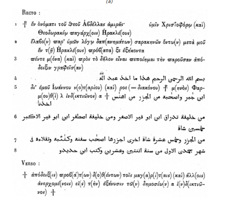 - بدأت البردية بالصيغة اليونانية "ev onomati tou teou" (بسم الله) بعد علامة الصليب.