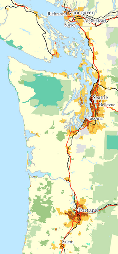The region's largest metropolitan areas are Greater Seattle, Washington, with 4 million people;[2] Metro Vancouver, British Columbia, with 2.84 million people;[3] and Greater Portland, Oregon, with 2.5 million people.[4]