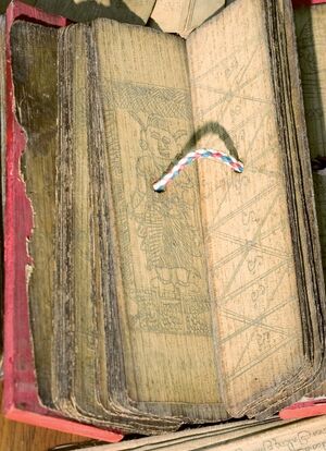 A palm leaf Hindu text manuscript (Lontara) from Bali, Indonesia, showing how the manuscripts were tied into a book