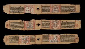 The text in palm leaf manuscripts was inscribed with a knife pen on rectangular cut and cured palm leaf sheets; colourings were then applied to the surface and wiped off, leaving the ink in the incised grooves. Typically, each sheet had a hole through which a string could pass, and using these holes, the sheets were bound together like a book by tying them together with a string. Such palm leaf texts typically had a lifespan of between a few decades and roughly 600 years before they started to rot due to moisture, insect activity, mould, and fragility. Thus the document had to be copied onto new sets of dried palm leaves.[2] The oldest surviving palm leaf Indian manuscripts have been found in colder, drier climates such as in parts of Nepal, Tibet, and central Asia, the source of 1st-millennium CE manuscripts.[6]