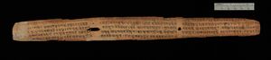 The individual sheets of palm leaves were called Patra or Parna in Sanskrit (Pali/Prakrit: Panna), and the medium when ready to write was called Tada-patra (or Tala-patra, Tali, Tadi).[6] The famous 5th-century CE Indian manuscript called the Bower Manuscript discovered in Chinese Turkestan, was written on birch-bark sheets shaped in the form of treated palm leaves.[6]