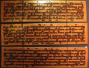 Palm-leaf manuscripts or sleuk rith as they are known in the Khmer language, can be found in Cambodia since Angkorian times as can be seen from at least one bas-relief on the walls of Angkor Wat. While they were of major importance until the 20th century, French archeologist Olivier de Bernon estimated that about 90% of all the sleuk rith were lost in the turmoil of the Cambodian Civil War while new supports such as codex books or digital media took over. Since then, conservation efforts have been made in pagodas such as at Wat Ounalom in Phnom Penh.[15]