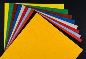 وقد عرفت أنواع مختلفة من الورق حسب طبيعة نسيجها وأليافها وألوانها (الأحمر، الأزرق، الأخضر، الأصفر..)، وكانت الأوراق من اللون الواحد تُعَدُّ لاحتواء النصوص المفضلة لدى الكاتب أو للمحافظة على الصفحة المزخرفة ولمنحها بهاء ورونقًا خاصَّيْن.
