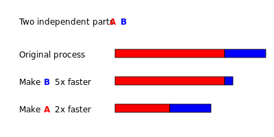 Assume that a task has two independent parts, A and B. B takes roughly 25% of the time of the whole computation. With effort, a programmer may be able to make this part five times faster, but this only reduces the time for the whole computation by a little. In contrast, one may need to perform less work to make part A twice as fast. This will make the computation much faster than by optimizing part B, even though B got a greater speed-up (5× versus 2×).