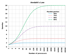 A graphical representation of Amdahl's law. The speed-up of a program from parallelization is limited by how much of the program can be parallelized. For example, if 90% of the program can be parallelized, the theoretical maximum speed-up using parallel computing would be 10x no matter how many processors are used.