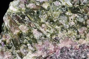 Most pegmatites have a simple composition, often being composed entirely of minerals common in granite, such as feldspar, mica, and quartz.[3] The feldspar and quartz often show graphic texture.[5] Rarely, pegmatites are extremely enriched in incompatible elements, such as lithium, caesium, beryllium, tin, niobium, zirconium, uranium, thorium, boron, phosphorus, and fluorine. These complex pegmatites contain unusual minerals of these elements, such as beryl, spodumene,[8] lepidolite, amblygonite, topaz, apatite, fluorite, tourmaline, triphylite, columbite, monazite, and molybdenite. Some of these can be important ore minerals.[5] Some gemstones, such as emerald, are found almost exclusively in pegmatites.[8]