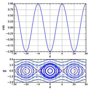 الشكل 5. Potential energy and phase portrait of a simple pendulum. Note that the x-axis, being angle, wraps onto itself after every 2π radians.