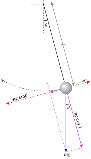 where g is the magnitude of the gravitational field, is the length of the rod or cord, and θ is the angle from the vertical to the pendulum.