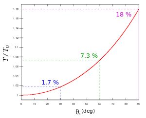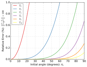 • ‘Not so large-angle’ formulae, i.e. those yielding good estimates for amplitudes below rad (a natural limit for a bob on the end of a flexible string), though the deviation with respect to the exact period increases monotonically with amplitude, being unsuitable for amplitudes near to rad. One of the simplest formulae found in literature is the following one by Lima (2006): , where .[10]
