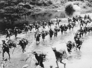 The PAVN was first conceived in September 1944 at the first Revolutionary Party Military Conference as the Information, Communication and Education Unit of the Liberation Army (alternatively translated as the Vietnam Information, Communication and Education Liberation Army, Việt Nam Tuyên truyền Giải phóng Quân) to educate, recruit and mobilise the Vietnamese to create a main force to drive the French colonial and Japanese occupiers from Vietnam.[18][19] Under the guidelines of Hồ Chí Minh, Võ Nguyên Giáp was given the task of establishing the brigades and the Propaganda Unit of the Liberation Army came into existence on 22 December 1944. The first formation was made up of thirty-one men and three women, armed with two revolvers, seventeen rifles, one light machine gun, and fourteen breech-loading flintlocks.[20] It fought the PAVN's first ever engagement at the Battles of Khai Phat and Na Ngan against French soldiers in late 1944. The United States' OSS agents, led by Archimedes Patti – who was sometimes referred as the first instructor of the PAVN due to his role - had provided ammunitions as well as logistic intelligence and equipment. They also helped train these soldiers, who formed the backbone of the Vietnamese military to successfully fight the Japanese and other opponents. For instance, the PAVN's July 19, 1945 attack at Tam Dao internment camp in Tonkin saw 500 soldiers kill fifty Japanese soldiers and officials, freeing French civilian captives and escorting them to the Chinese border. The PAVN also fought the Japanese 21st Division in Thai Nguyen that year, and regularly raided rice storehouses to alleviate an ongoing famine.[21]
