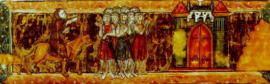 بطرس الناس يوضح للصليبيين الطريق إلى بيت المقدس. رسم فرنسي (ح. 1270).