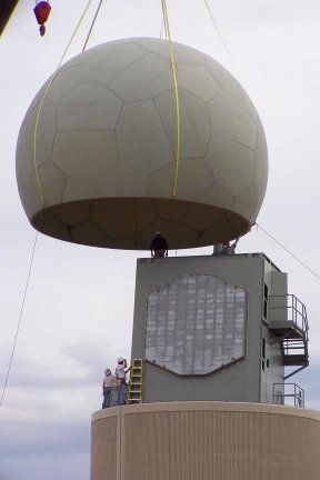 تركيب رادار AN / SPY-1A في المختبر الوطني للعواصف الشديدة ، نورمان ، أوكلاهوما. يوفر رادوم المرفق الحماية من الطقس.