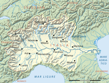 خريطة تبين نهر پو وروافده في سهل پادانو. لاحظ البحيرات الإيطالية العديدة على هامش الألپ.