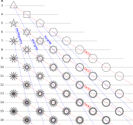 A regular polygram {p/q} can either be in a set of regular star polygons (for gcd(p,q) = 1, q > 1) or in a set of regular polygon compounds (if gcd(p,q) > 1).[1]